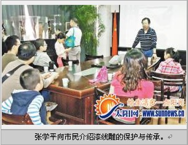 晨报讯(记者 陈巧恩)除了“老面孔”摄影讲座与广场舞培训外,上周末的文艺大讲堂首开民间文艺讲座———走进厦门蔡氏漆线雕艺术馆听大师漫谈传统工艺瑰宝漆线雕。该场讲座由厦门市民间文艺家协会承办,主讲人是赫赫有名的中国工艺美术大师蔡水况和厦门惟艺漆线雕艺术有限公司负责人张学平。