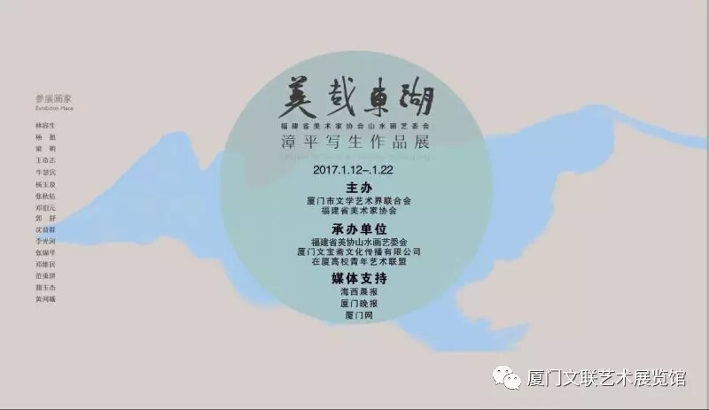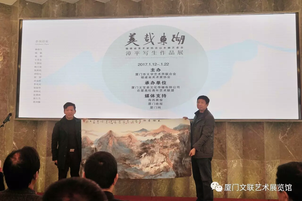 1月12日,美哉东湖•福建省美术家协会山水画艺委会漳平写生作品展在厦门文联艺术展览馆开展。本次画展包含了林容生、杨挺、梁明等16位福建山水画名家围绕着漳平市溪南镇拥有400多年历史的东湖村而创作的作品。东湖村景色秀美,民风淳朴,激发了画家们的灵思妙想,创作者以笔墨抒发了自己的文心诗情。