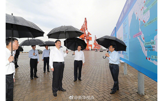 习近平总书记19日下午冒雨考察坐落于广西北部湾的北海市铁山港公用码头。天高水阔,吊车高耸入云。他听取码头规划和建设情况,了解广西北部湾经济区发展建设和面向东盟开放合作情况。习近平表示,铁山港有区位优势,发展前景广阔,将来是北部湾经济区一个重要依托。要建设好北部湾港口,打造好向海经济。我们常说要想富先修路,在沿海地区要想富也要先建港。