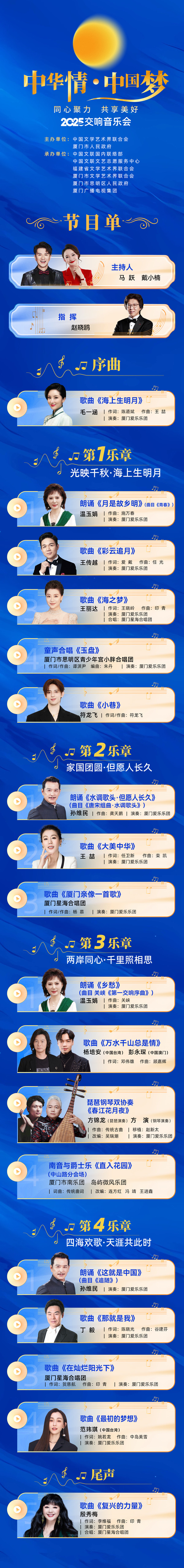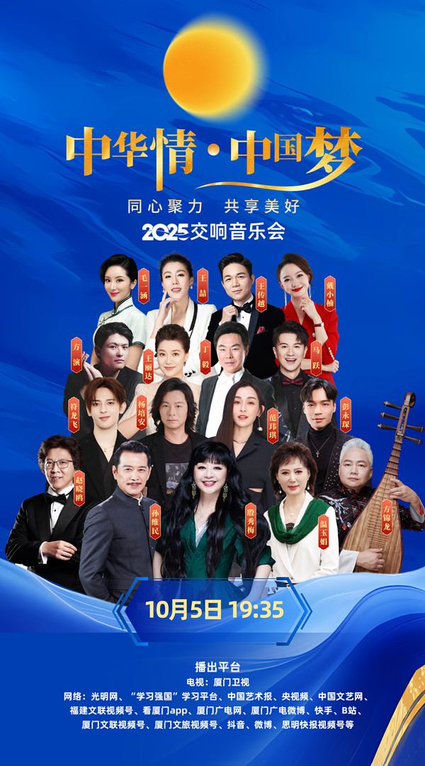 由中国文联、厦门市人民政府主办,中国文联国内联络部、中国文联文艺志愿服务中心、福建省文联、厦门市文联、厦门市思明区人民政府、厦门广播电视集团承办的2025年“中华情·中国梦”交响音乐会将于明晚19:35在“电视端+网络端”同步播出。