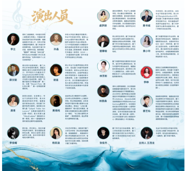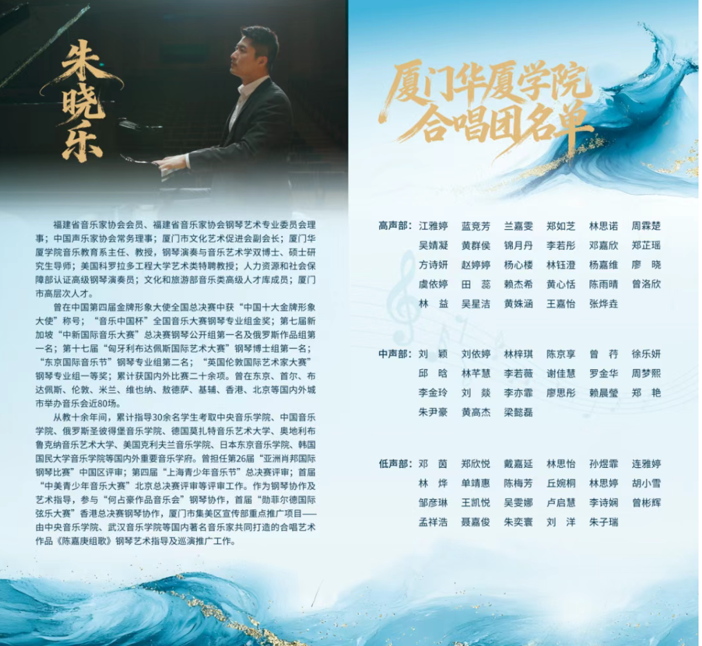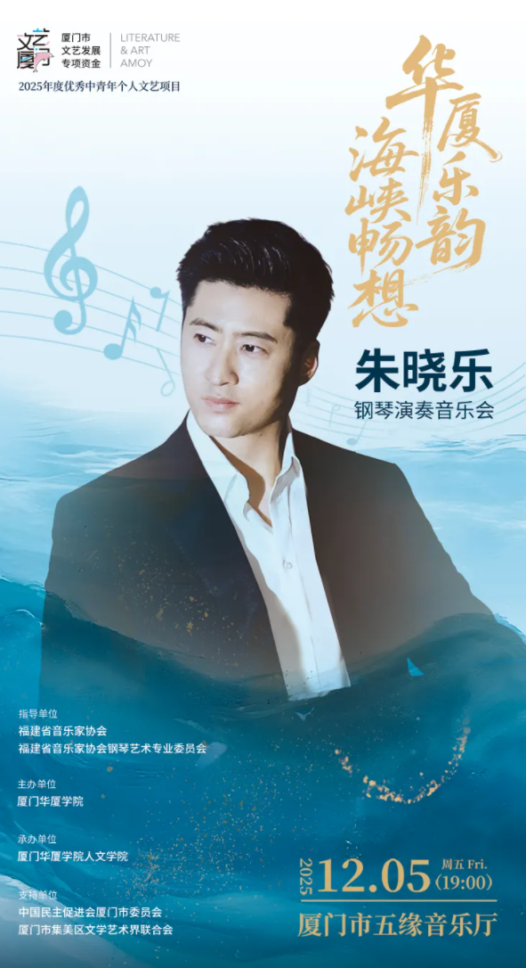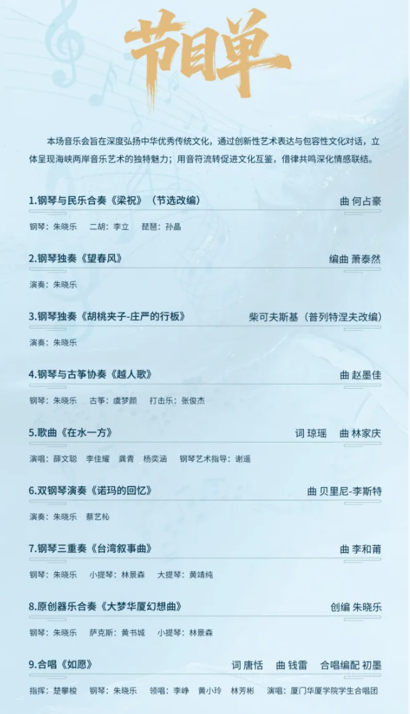 本场音乐会以“创新性艺术表达”与“包容性文化对话”为核心,精选9首经典与创新作品、18位演出嘉宾,立体呈现海峡两岸音乐艺术的独特魅力。钢琴演奏与音乐艺术学双博士、厦门华厦学院音乐教育系主任朱晓乐钢琴领衔。