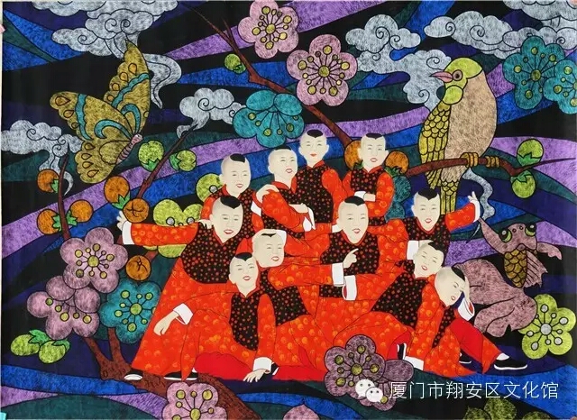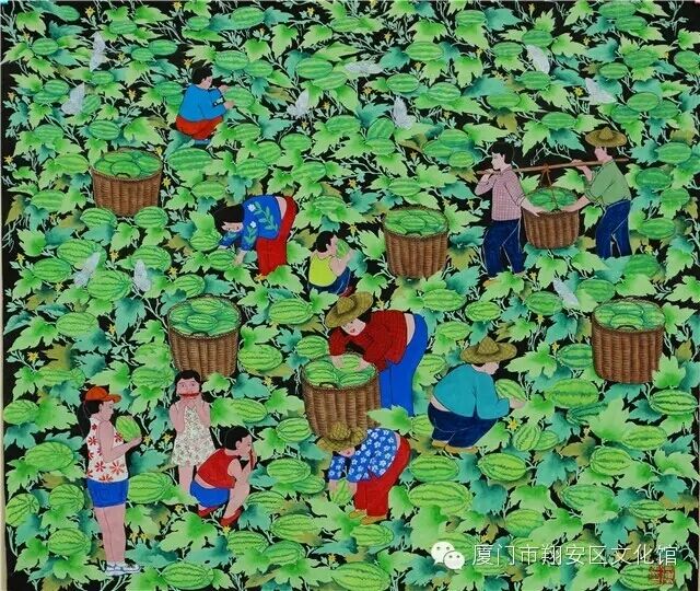 此次参加画展,厦门市民间文艺家协会推荐了由翔安区文化馆精心组织创作选送的农民画,其中市民协顾问,老一辈翔安农民画画家梁金城和梁永圳合作的作品《小三通》在此次画展上获得银奖,颜朝阳、宋宗呈、唐庆、魏渊树、梁永圳等所做的《瓜乐其融》《翔安答嘴鼓》《新城新气象》《拍胸舞》《两岸渔女同心曲》《闽南民居》6幅农民画获优秀奖。这些获奖作品描绘了翔安山川市井、风土民俗,艺术地体现了闽南民俗和民间生活,风格注重传统,注重生活。展现了翔安农民画画家的风采,展示了翔安农民画的实力。