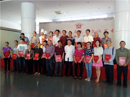 市民协主席杨广敏在同安区第五届民俗文化艺术节民间传统手工艺品展览闭幕式上为民间艺人开讲“坚守传统手艺”